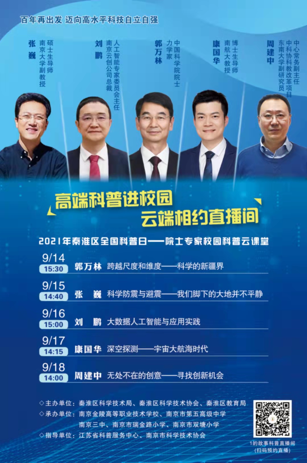 9月14日-18日,2021年秦淮區(qū)全國科普日——院士專家校園科普云課堂系列活動將連續(xù)舉辦5場。活動在江蘇省科普服務(wù)中心、南京市科學(xué)技術(shù)協(xié)會指導(dǎo)下,由秦淮區(qū)科學(xué)技術(shù)局、區(qū)科學(xué)技術(shù)協(xié)會、區(qū)教育局主辦?;顒又荚谙蚬姺窒砜茖W(xué)家精神,幫助青少年領(lǐng)會科技魅力,在實(shí)踐中體驗(yàn)科技知識,真正實(shí)現(xiàn)各項(xiàng)科普活動惠及于民、方便于民,真正讓大眾走進(jìn)科學(xué)、體驗(yàn)科學(xué)、愛上科學(xué)。