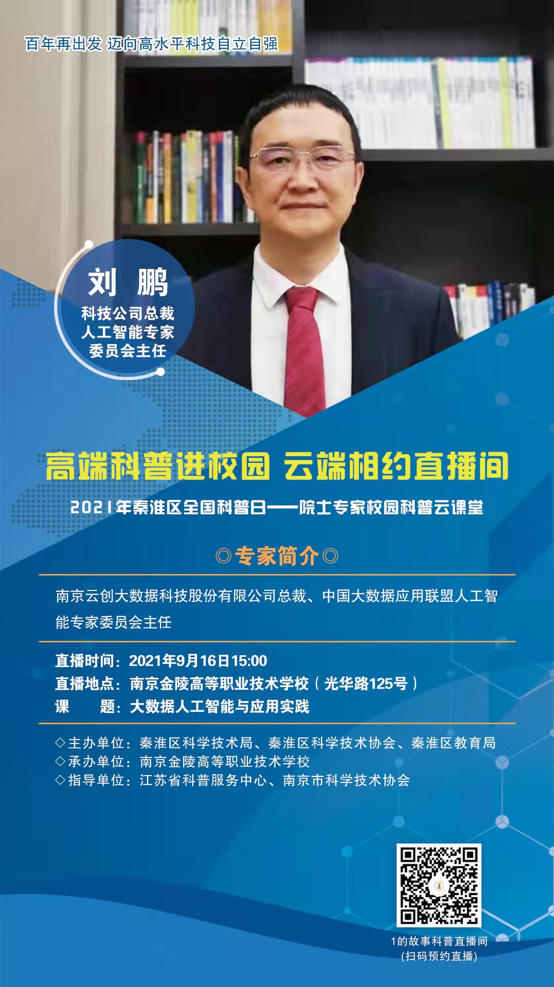 9月16日下午3點(diǎn),以“高端科普進(jìn)校園 云端相約直播間”為主題的2021年秦淮區(qū)全國科普日——院士專家校園科普第三場云課堂如期開課。劉鵬教授為大家?guī)砹恕按髷?shù)據(jù)人工智能與應(yīng)用實(shí)踐”主題報告。