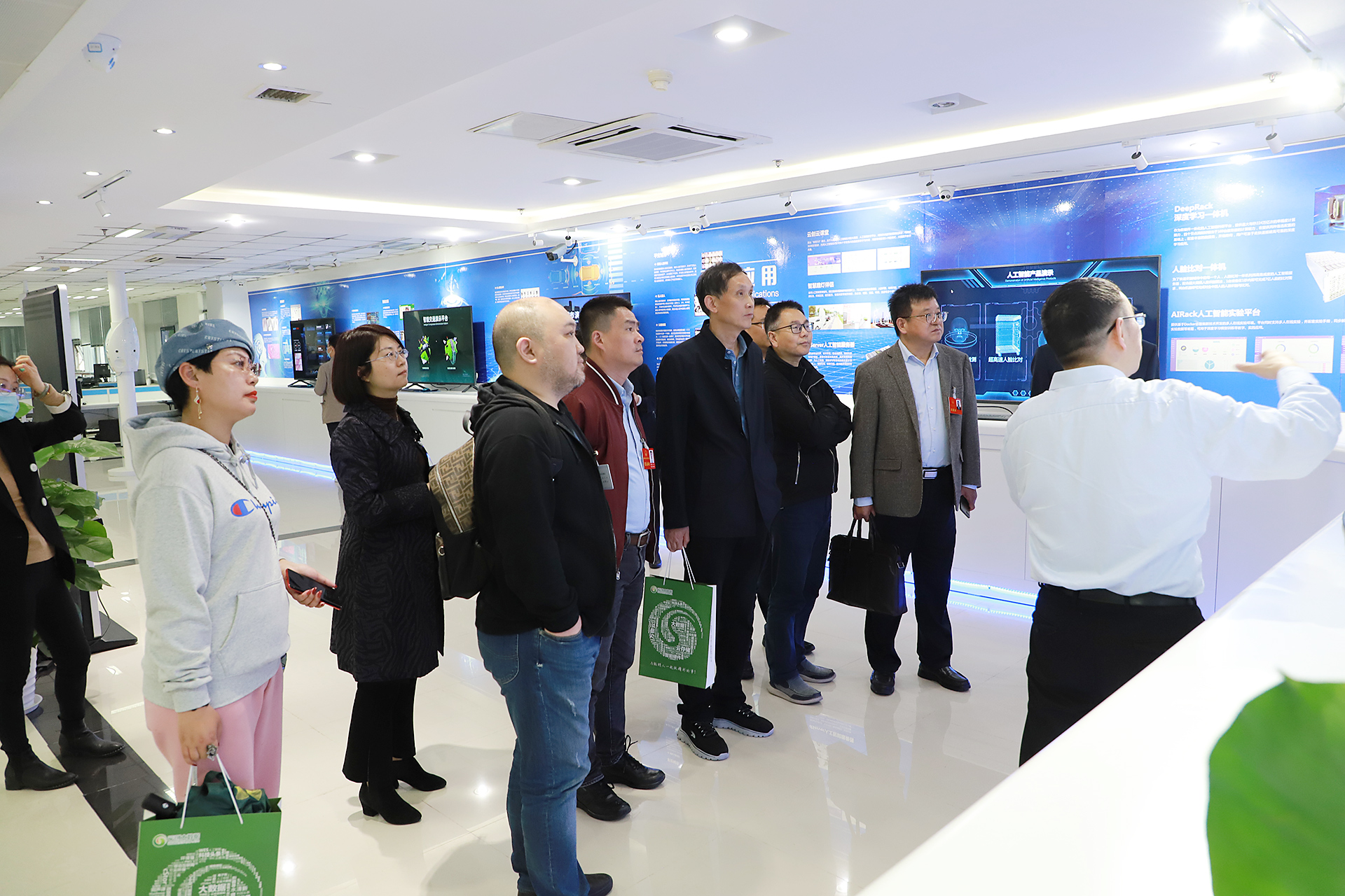 參觀過程中,劉鵬教授帶來賓逐一對九樓榮譽(yù)資質(zhì)和技術(shù)專利展區(qū)、劉鵬教授主編圖書展區(qū)、大數(shù)據(jù)運(yùn)營中心,以及十樓人工智能研究院等多處進(jìn)行參觀。來賓時不時針對感興趣的話題與劉鵬教授進(jìn)行交流,劉鵬教授采用通俗幽默的語言為大家一一作出分析。